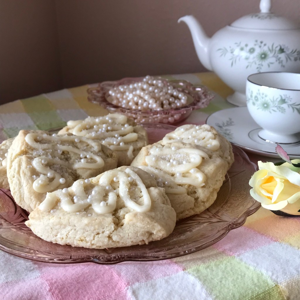 I decorated my scones with lemon drizzle, adding sparkly sugar and edible pearls. Lemon is a refreshing flavor for springtime tea.