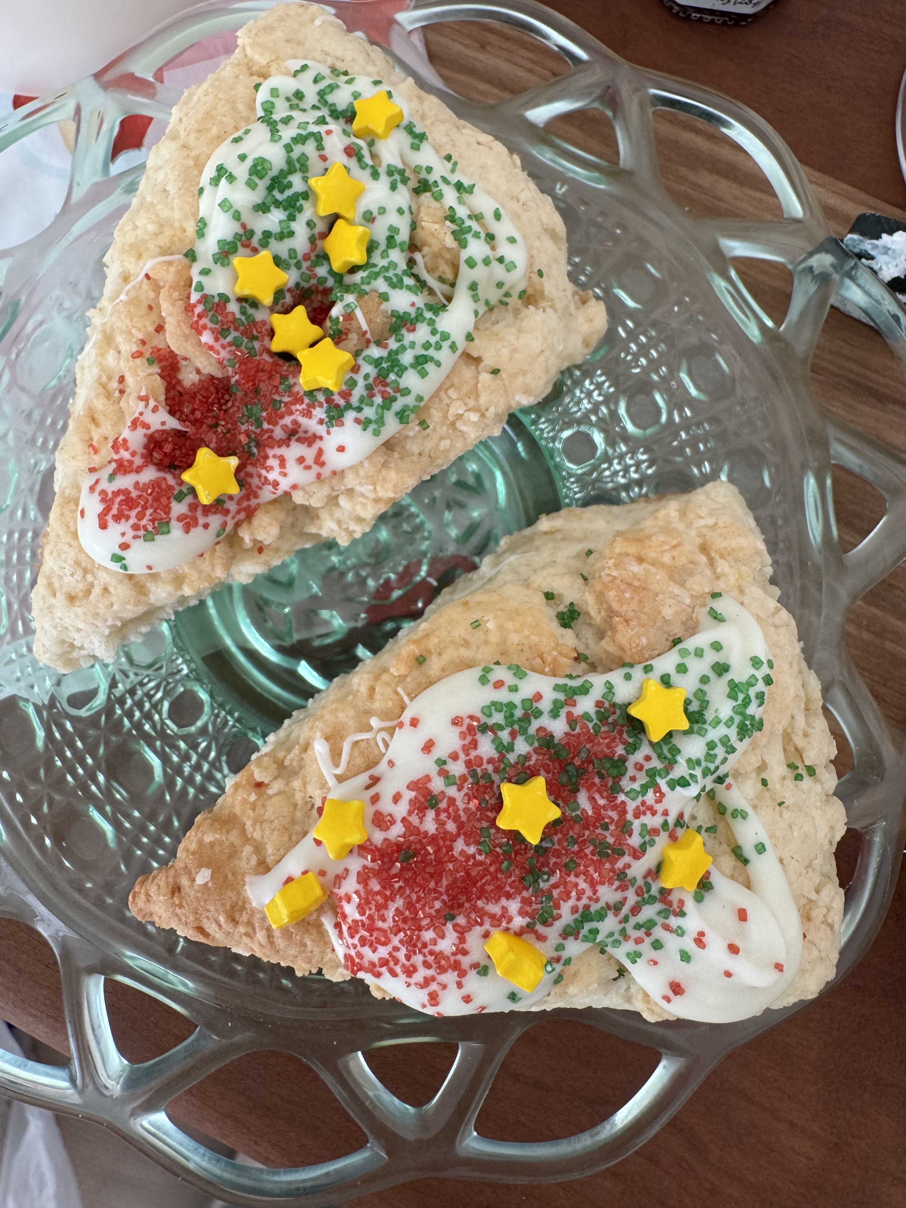Today I’m serving seasonally appropriate cranberry and orange scones with a delightful Stash Christmas Eve tea, a spiced spearmint blend flavored with cinnamon and orange. The photo includes a Santa painted by my mother who loved all things Christmas…but especially this time of giving to others in Christian service.