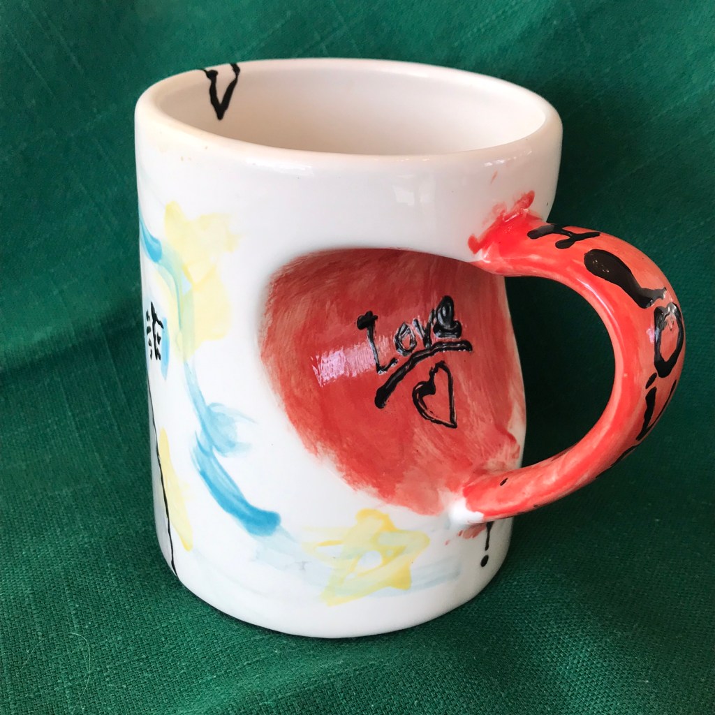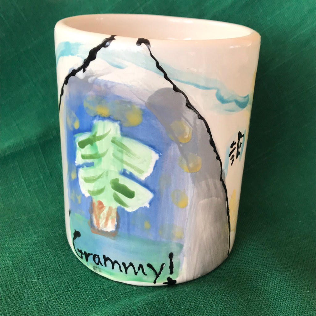 I’m pouring tea into a mug designed by my eight-year-old granddaughter. She painted this design for me….knowing I love mountains and that the title of my first story, written when I was twelve-years-old, was “ The Mystery of the Diamond Mountain Men.”